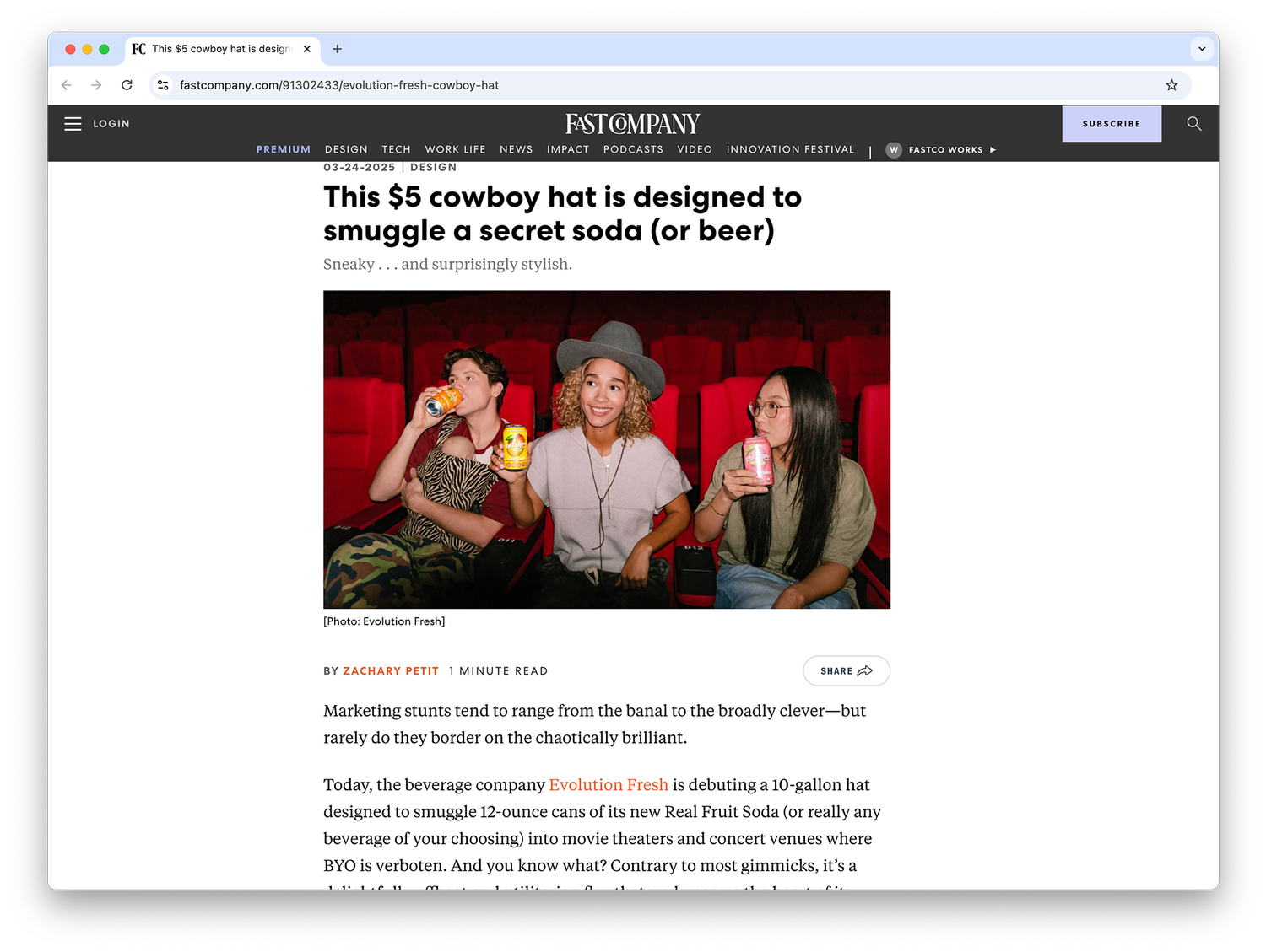Sick of not being able to sneak decent soda into the movie theatre? Evolution Fresh have you covered. We created the ultimate smuggling props: a chain, a pair of shoes, a belt buckle, a baby bjorn, a fake cast, and step-by-step instructions on how to get Real Fruit Soda past the ticket taker. The ten-gallon hats sold out almost immediately.